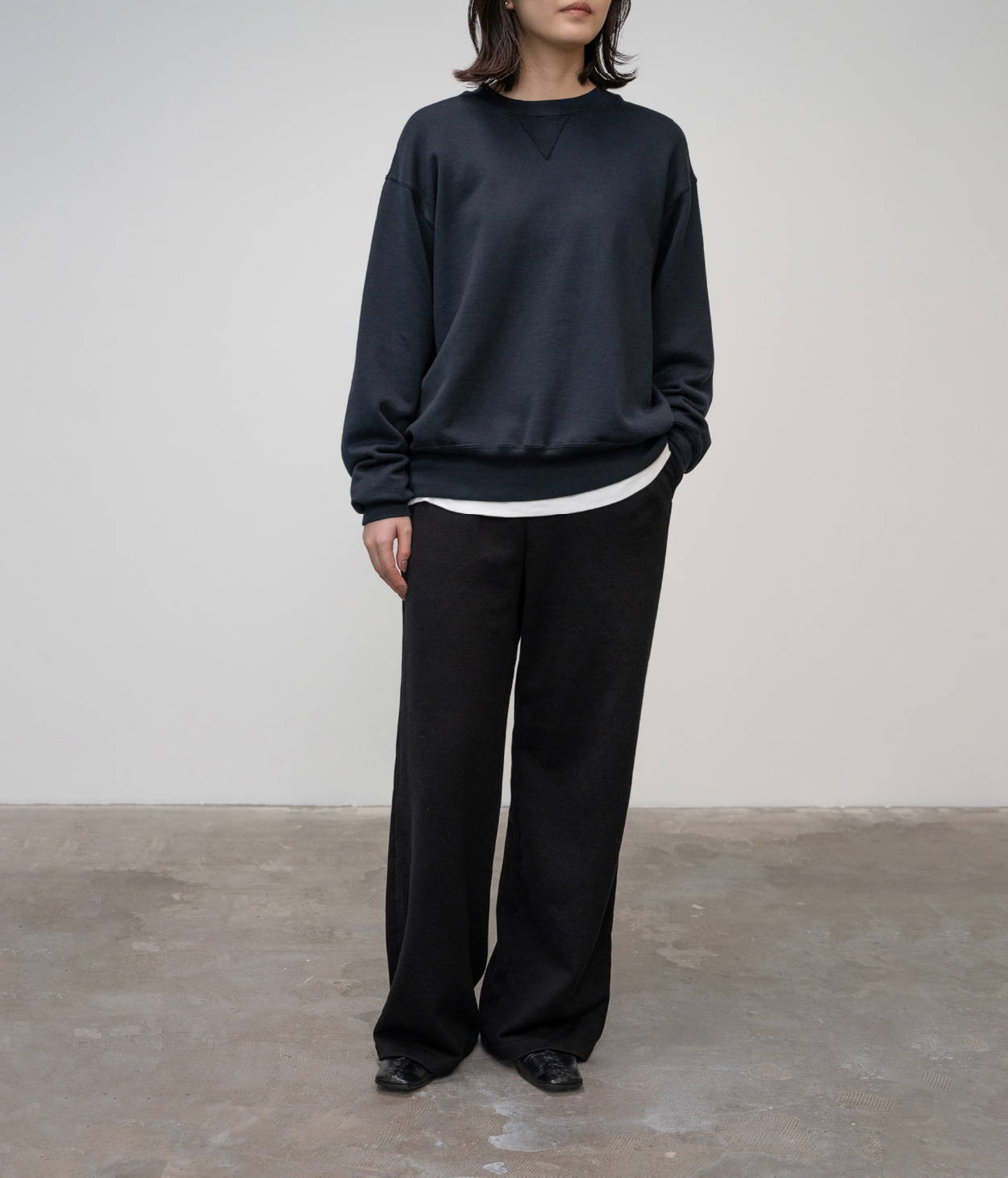 青山:シンプルでベーシックな形だけど、「COTTONY®」の裏毛を使うことでハイゲージセーターのような艶と落ち感が生まれ、スウェット×デニムのような定番カジュアルなスタイリングも、クリーンで大人な印象になるんですよね。僕はジャストサイズで3(M)で4(L)も両方着ますが、どちらで着用しても着ぶくれしません。この時期ですとジャケットの下に合わせても、バストやアームホールのごわつきなく着用でき、現代的なスウェットの要素としては重要なのかなと感じています。