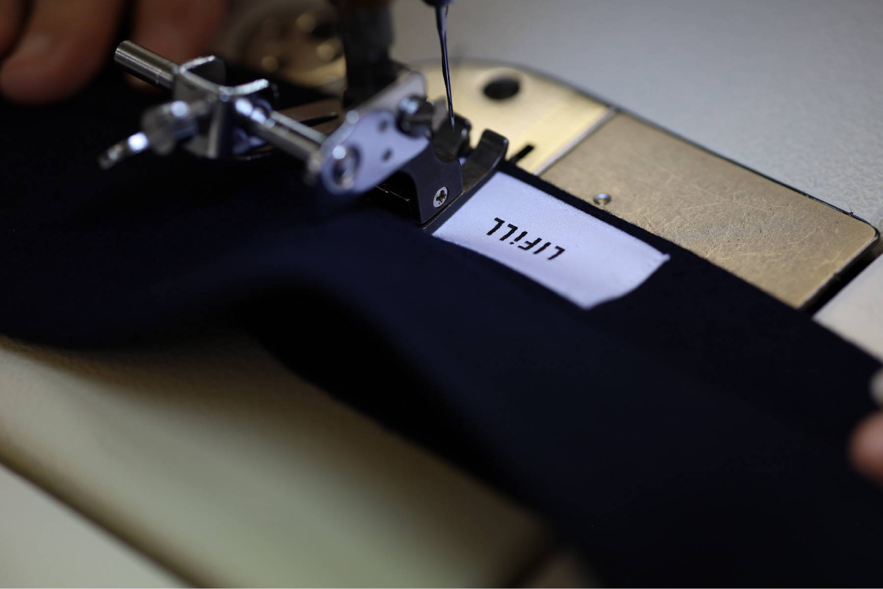 LIFiLLのこのアイテムは、伸縮性のある生地を使っているため、裁断では生地の切り縮みが起きないように特に注意が必要でした。また、生地が伸びると糸調子(※1)が変わってくるので、ミシンの糸調子を細かく調整しながら作業しました。伸縮性のある生地は裁断も縫製も難しいです。一見シンプルな生地に見えても、ニットのような厚みや伸縮性があることで、思った以上に縫いにくかったですね。