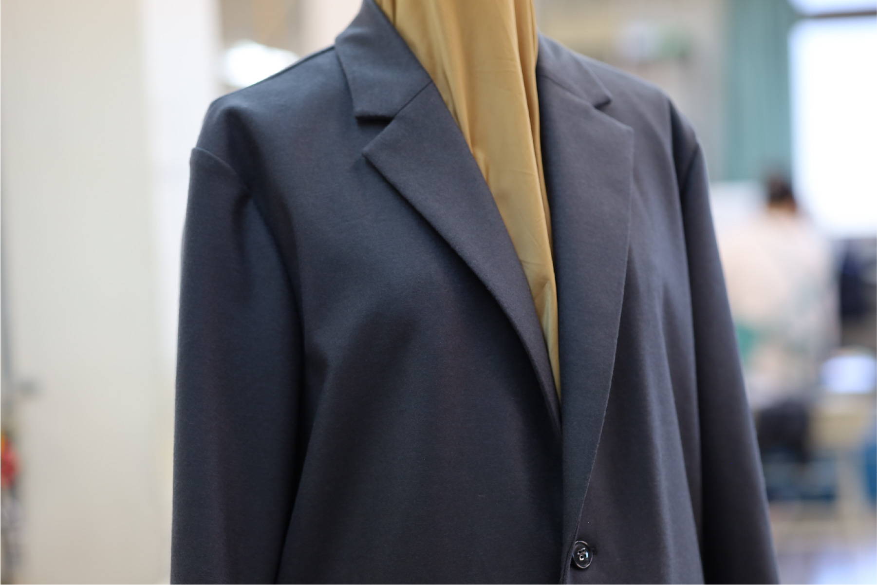 またジャケットはパイピング始末が多く大変でした。縫い代が重なってさらに生地が厚くなり、パイピングが外れてしまうことがあったため、縫い代をカットしきれいに仕上げられるようにしています。このパイピング始末で使用するテープも、良い幅のテープが見つからなかったので、最終的には裁断したテープを使用しています。