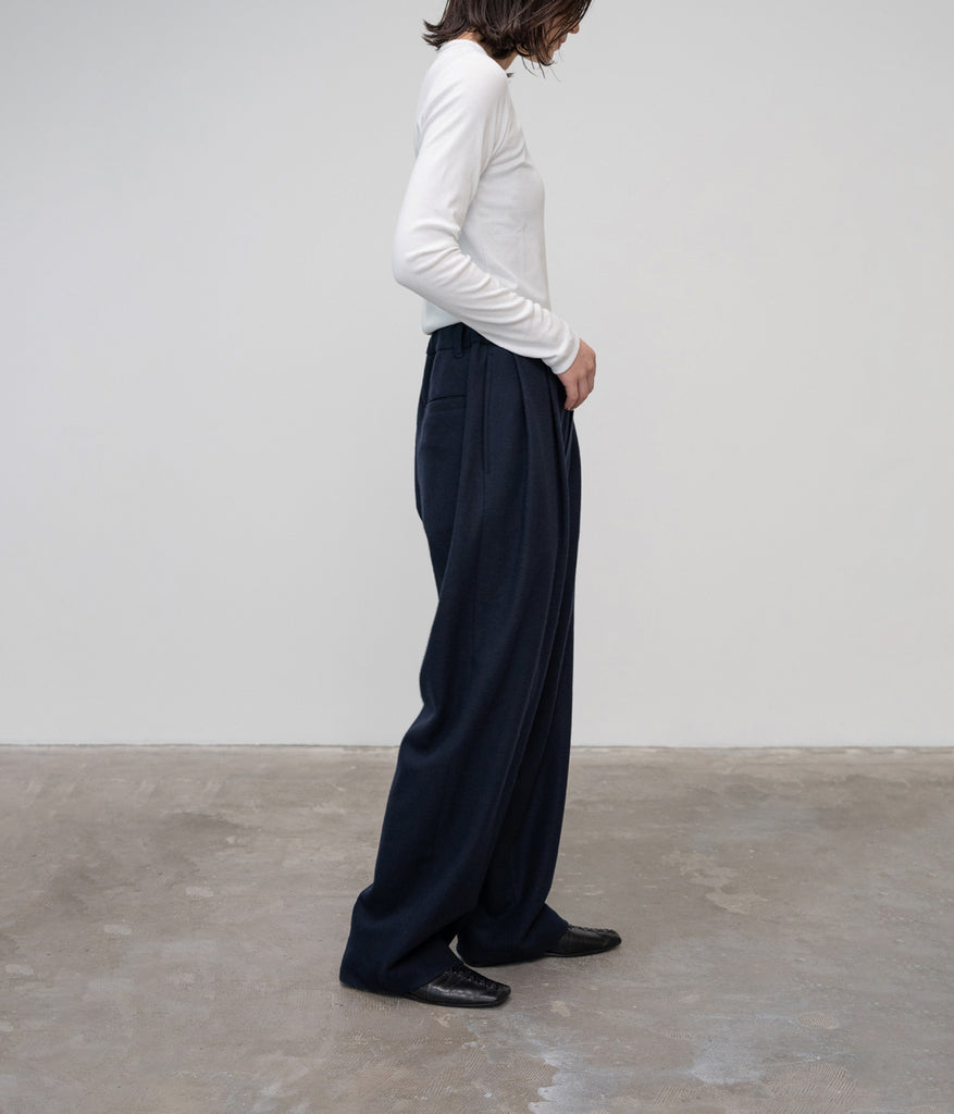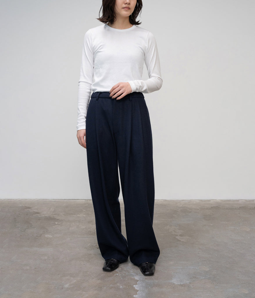 襟元や袖に使われるリブ編み生地をボディ部分に贅沢に使いました。やや薄手で軽やか、非常に繊細なハイゲージのフライス組織は、とてもソフトでカラダのラインによく馴染みます。1枚ではもちろん、インナーとしても長くお使いいただけます。