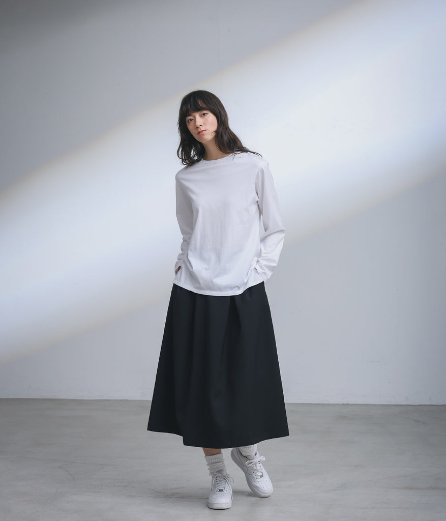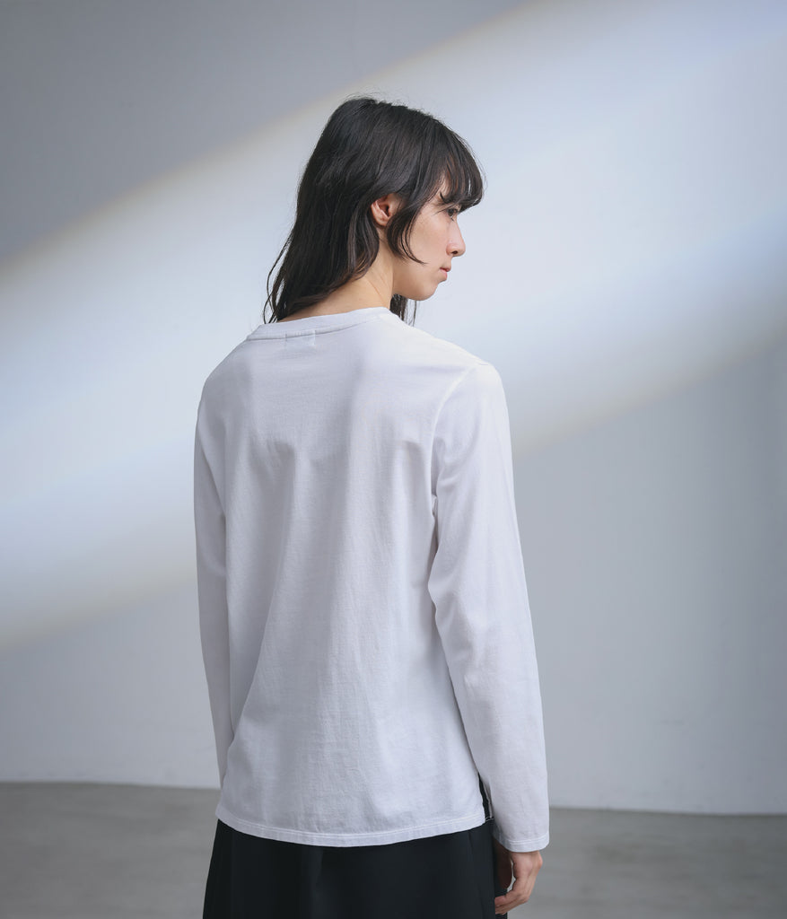 生地の上質さを体感できるフラッグシップモデルの「COTTONY® TEE」をベースに、さらにリラックスして着用できるよう細部にまでこだわったロングスリーブTシャツ。少し長めの袖丈と、締め付けないゆとりある袖口で今のムードを抑えつつ、「COTTONY® TENJIKU」のシルクのような光沢感と柔らかさ、通常より細めのステッチで品の良さをプラス。首元には伸縮性のあるハイゲージフライスを採用し、洗濯後の伸び、たるみを加味した縫製で型崩れしにくく長く愛用いただけます。女性らしさ感じるサイドスリット入りで、エフォートレスな大人のロンTに仕上がりました。
