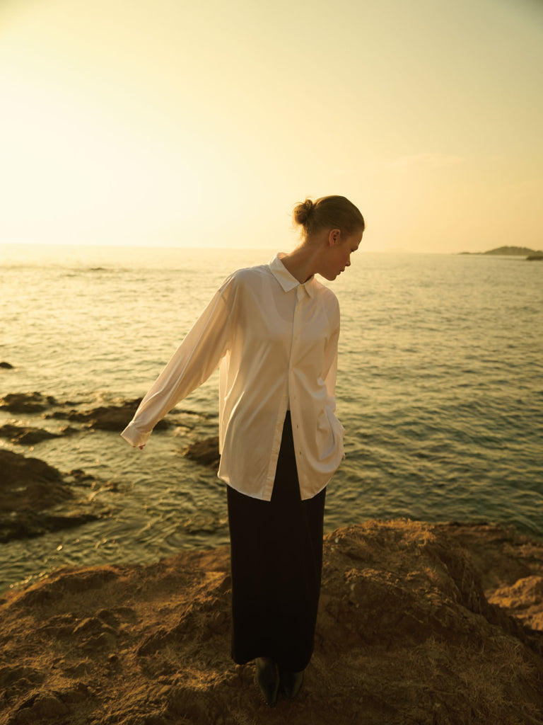 シンプルなドレスシャツをオーバーサイズ気味にデザインし、クリーンな印象を与えるコンパクトな襟が特徴です。洗練されたデザインは、あらゆるシーンで万能に活躍します。