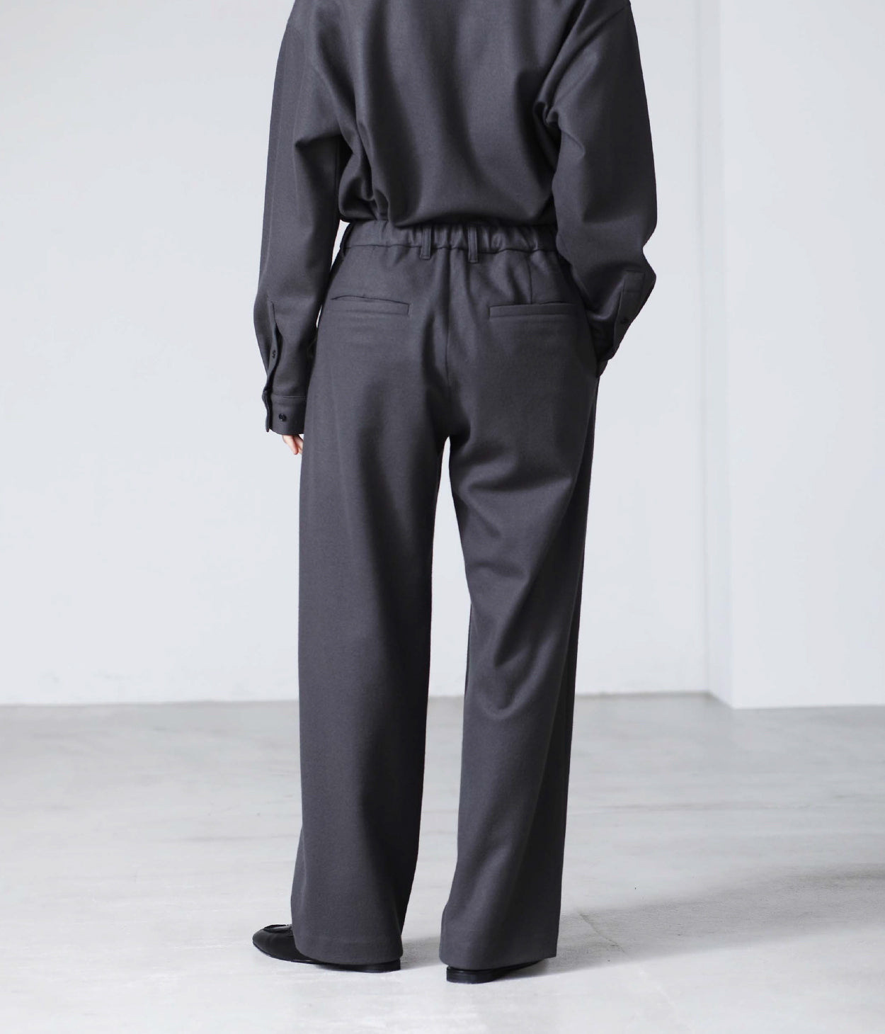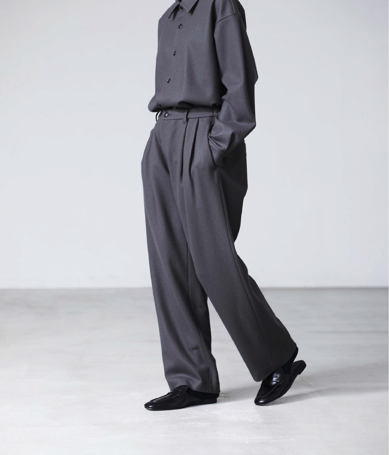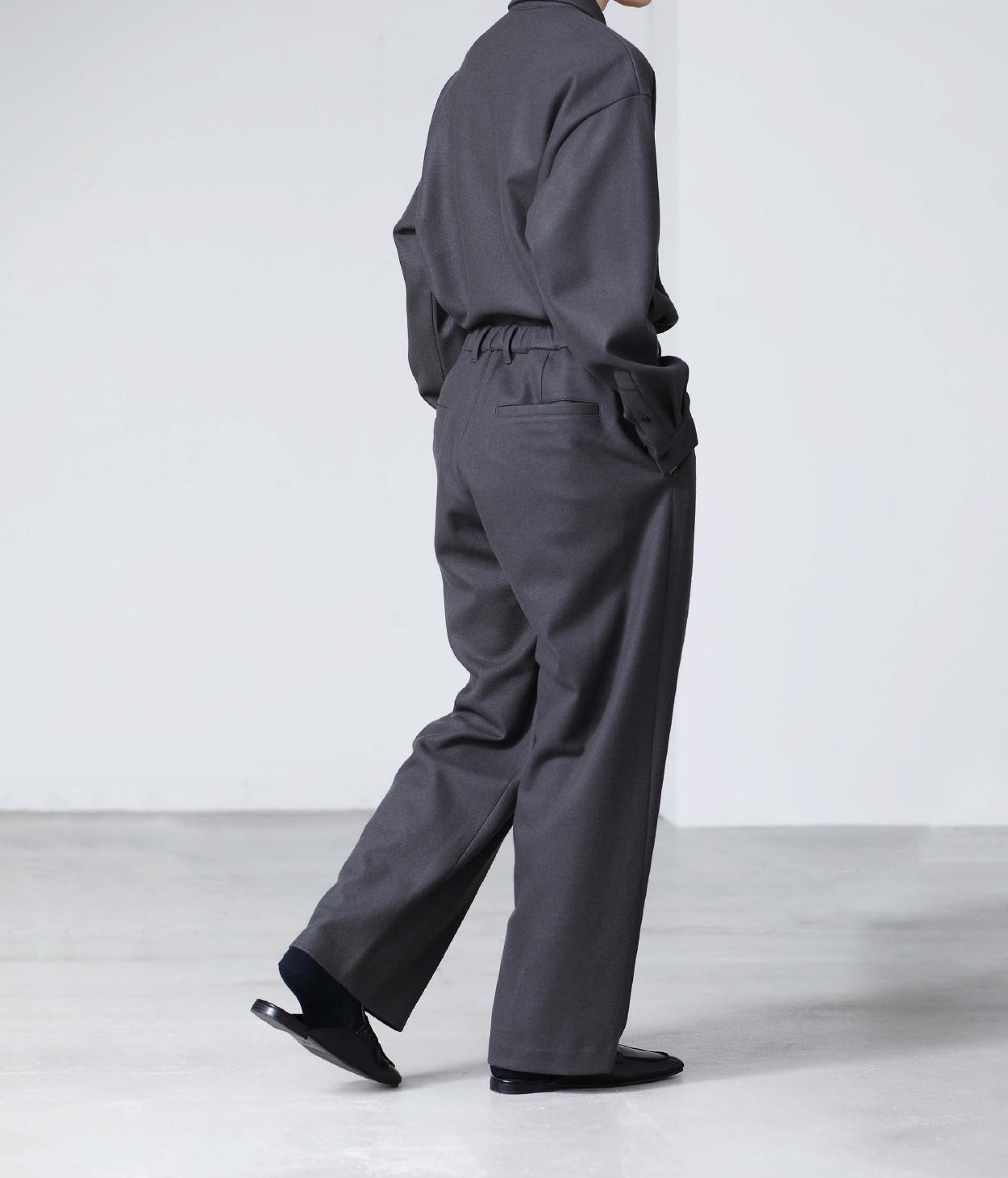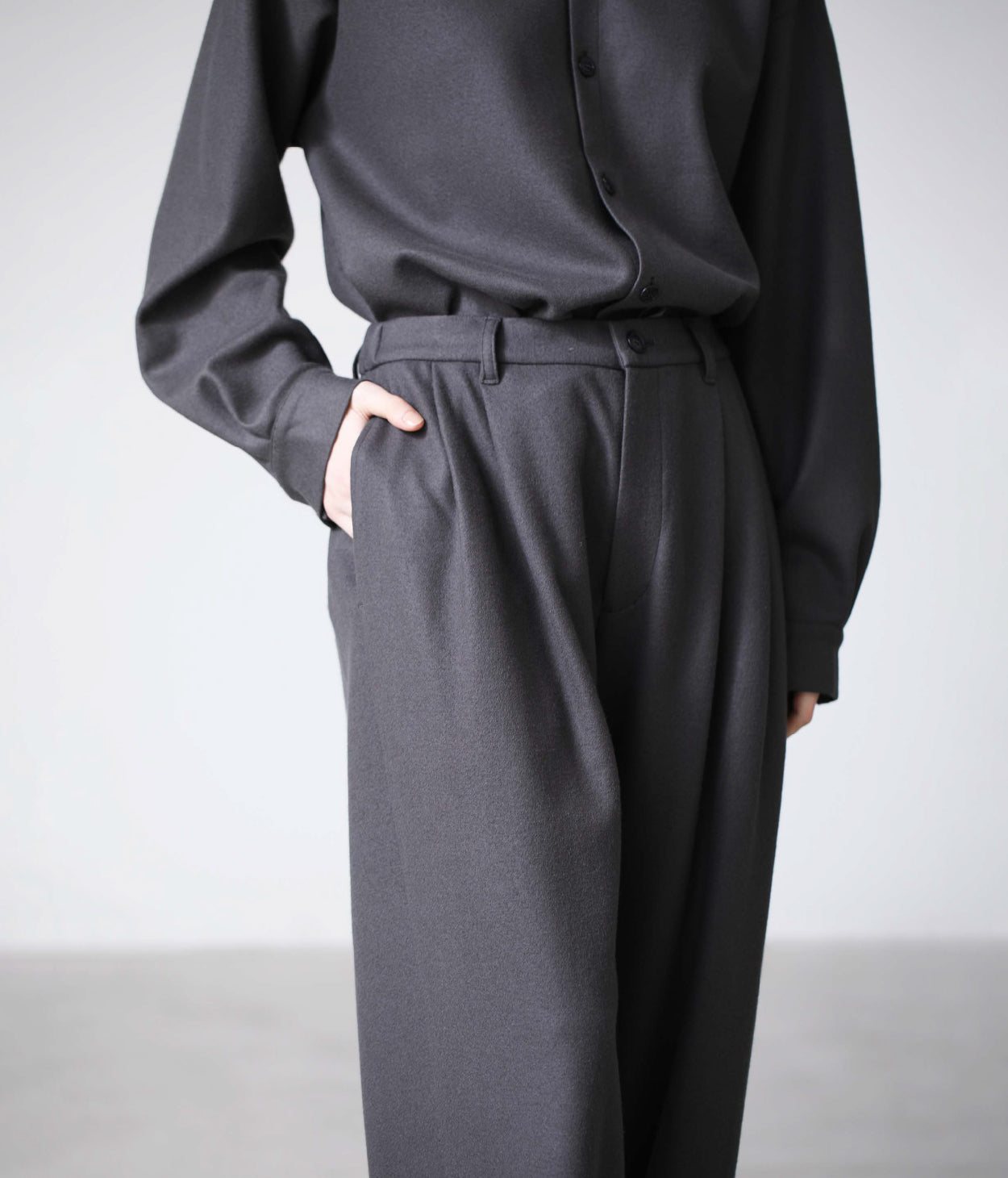 ヒップ~腿周りのボリュームを出しつつ裾にかけて緩くテーパードにすることで、男性、女性どちらが履いても野暮ったく見えずニュアンス感のあるシルエットに仕上げました。