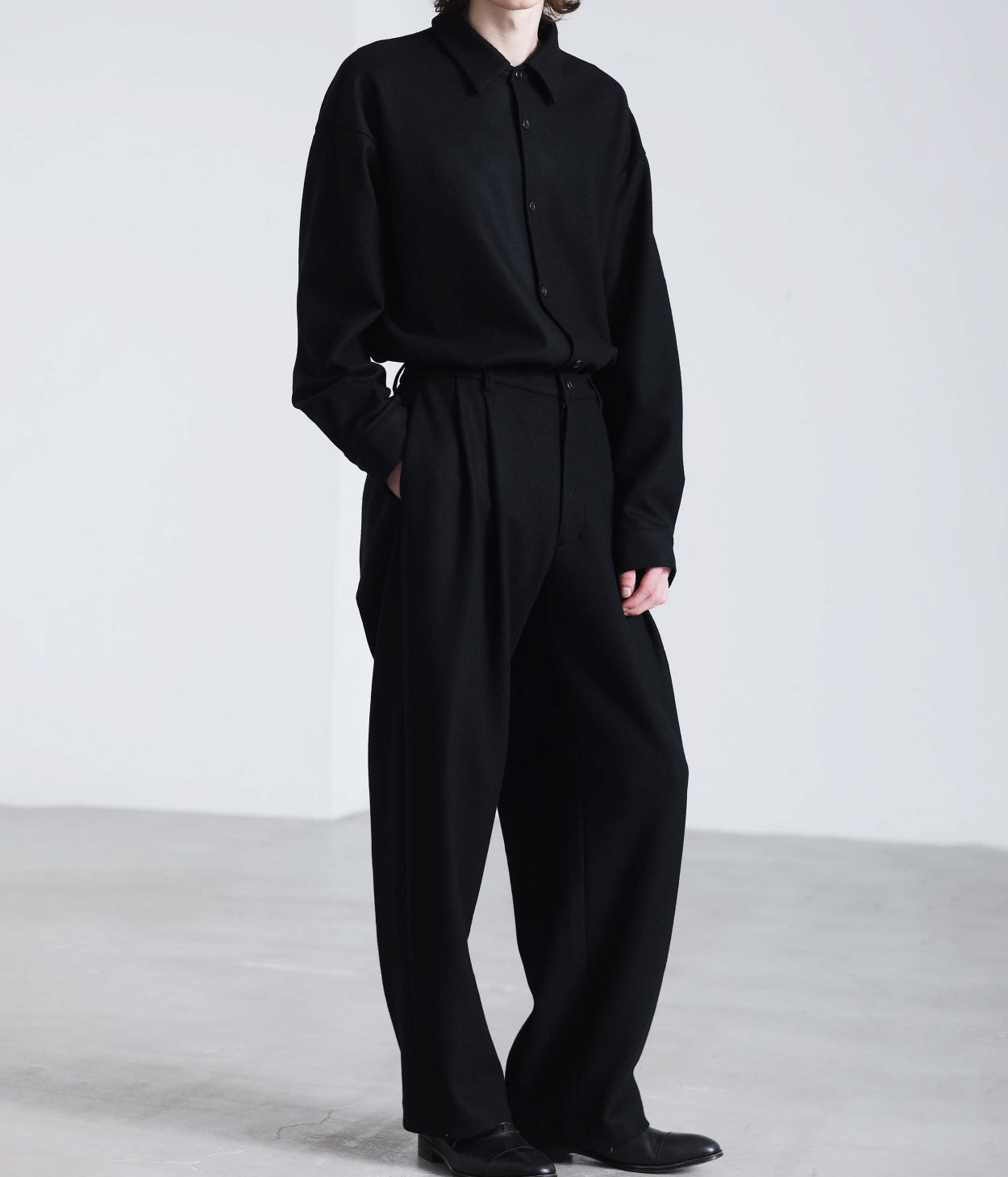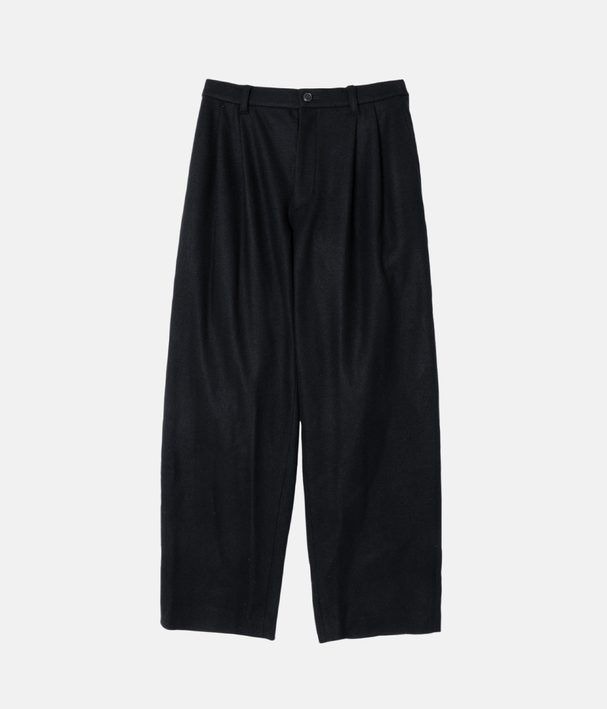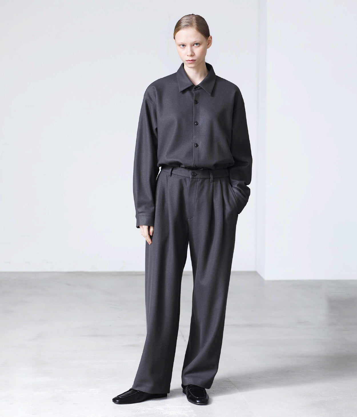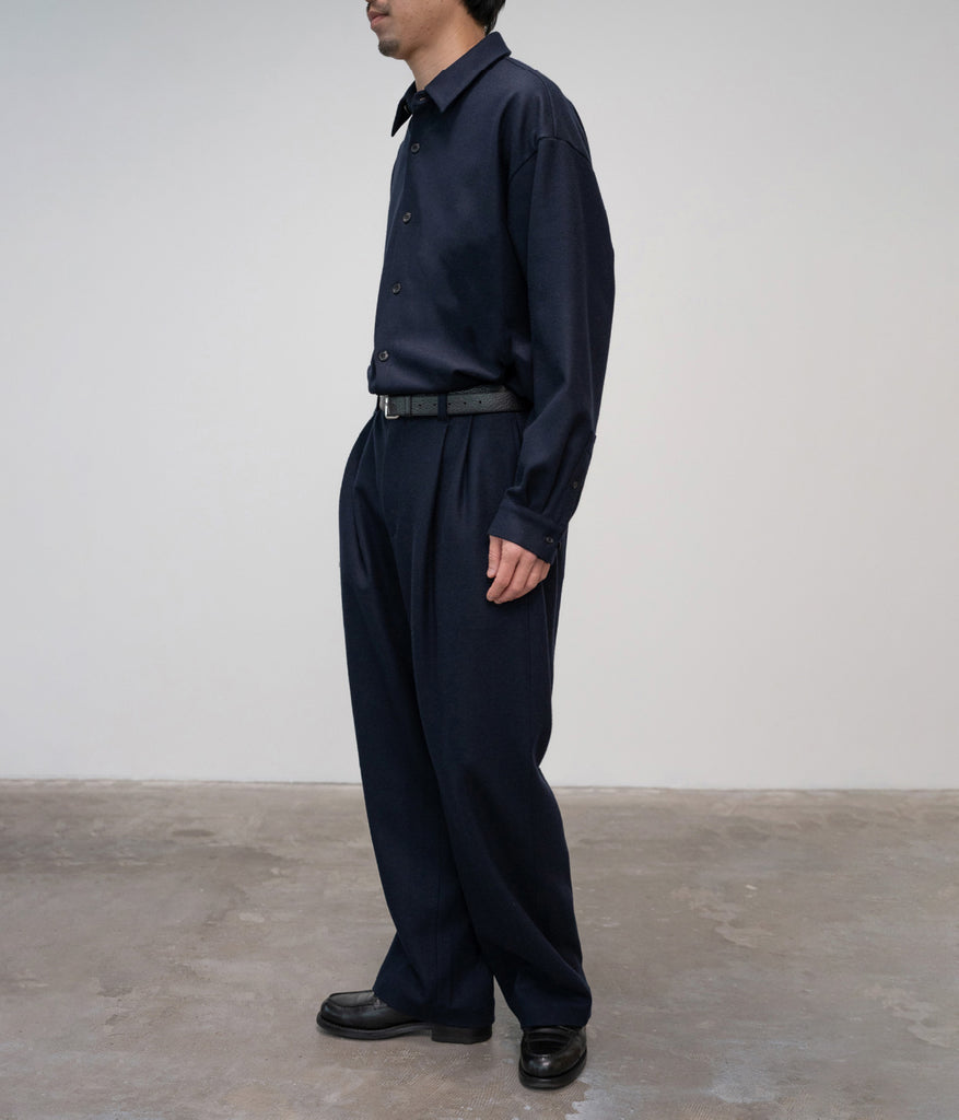 ヒップ~腿周りのボリュームを出しつつ裾にかけて緩くテーパードにすることで、男性、女性どちらが履いても野暮ったく見えずニュアンス感のあるシルエットに仕上げました。