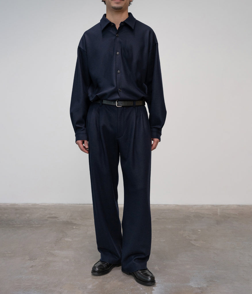 ウールのスムースをミルド加工することにより、起毛感のある軽くて暖かい生地に仕上げています。また最高級ウールと言われている「SUPER140'S」のピュアウールを使用しており、上質な艶と柔らかな風合いが特徴のオリジナル素材です。