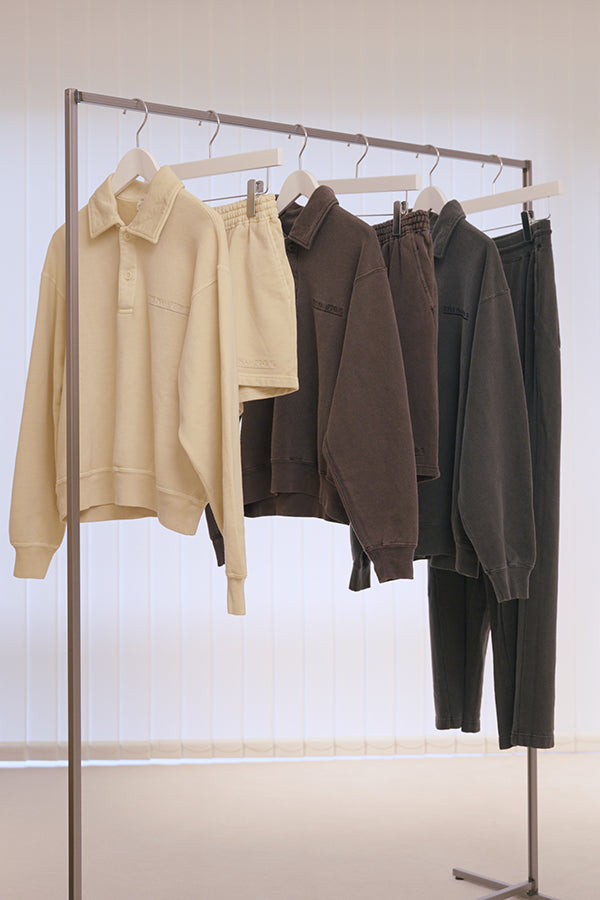 一ツ山さん:大胆に変化する「サイジング」です。通常のサイズ展開の方式ではなく、同型に対し、ショート丈・ミディ丈・ロング丈とフォルム自体を大きく変化させています。私自身「このデザインでショート丈があったらな〜」と思った経験が何度もあり、今回のコラボでは、好きな丈感のトップスとボトムスを、自由に組み合わせて楽しんでもらえるようにしました。ユニセックス仕様で、カップルや家族 で共有して着ることも想定しています。また、カラーも、墨黒と呼ばれる柔らかい黒、ブラウン、そして卵のようなやわらかいイエローの3色を用意。定番色として使いやすいものから、今季のトレンドカラーまで、どれも他にはない絶妙なトーンに仕上がりました。