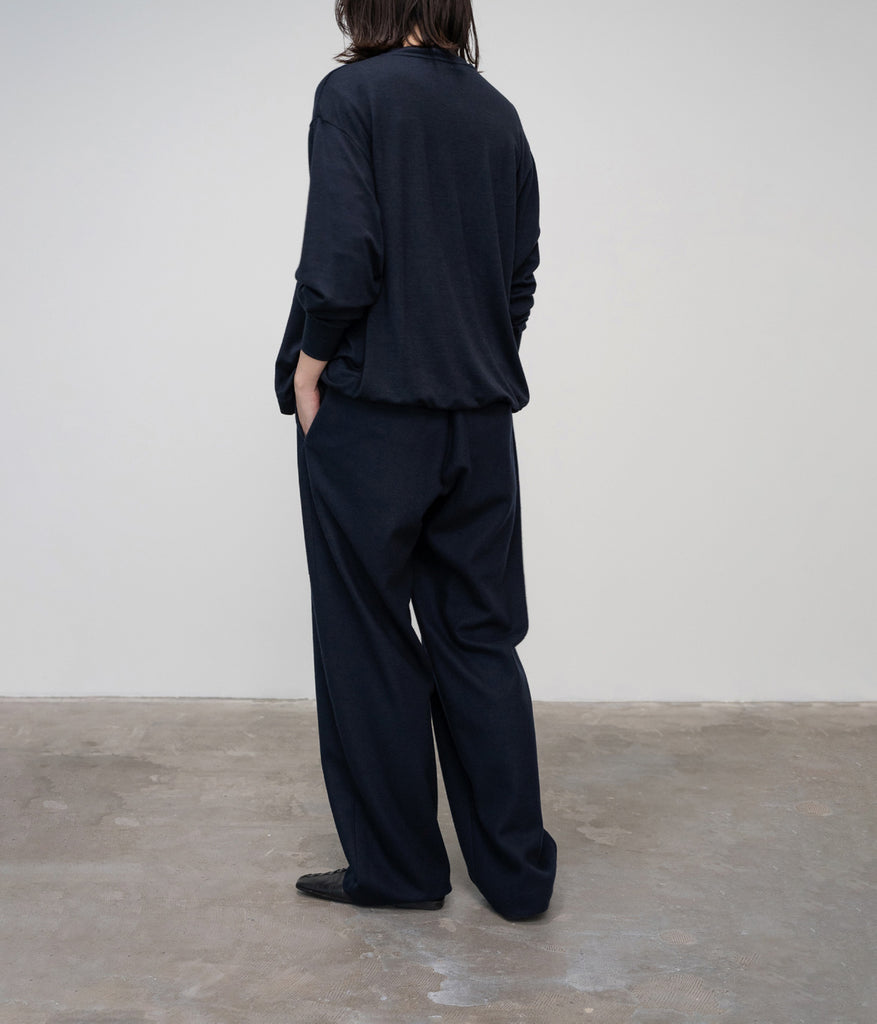袖と裾には太めのリブをあしらい、シンプルさの中にさりげないアクセントを添えました。