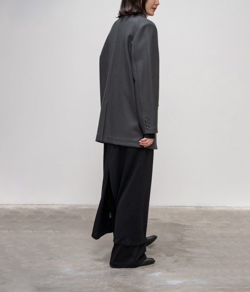 肩線の接ぎ位置を後ろ側にずらすことで肩回りをフラットに見せ、ベンツや袖口の角を額縁始末で仕上げることで、すっきりとした印象に。また裏側も美しく見えるよう、縫い代をパイピングで処理しています。