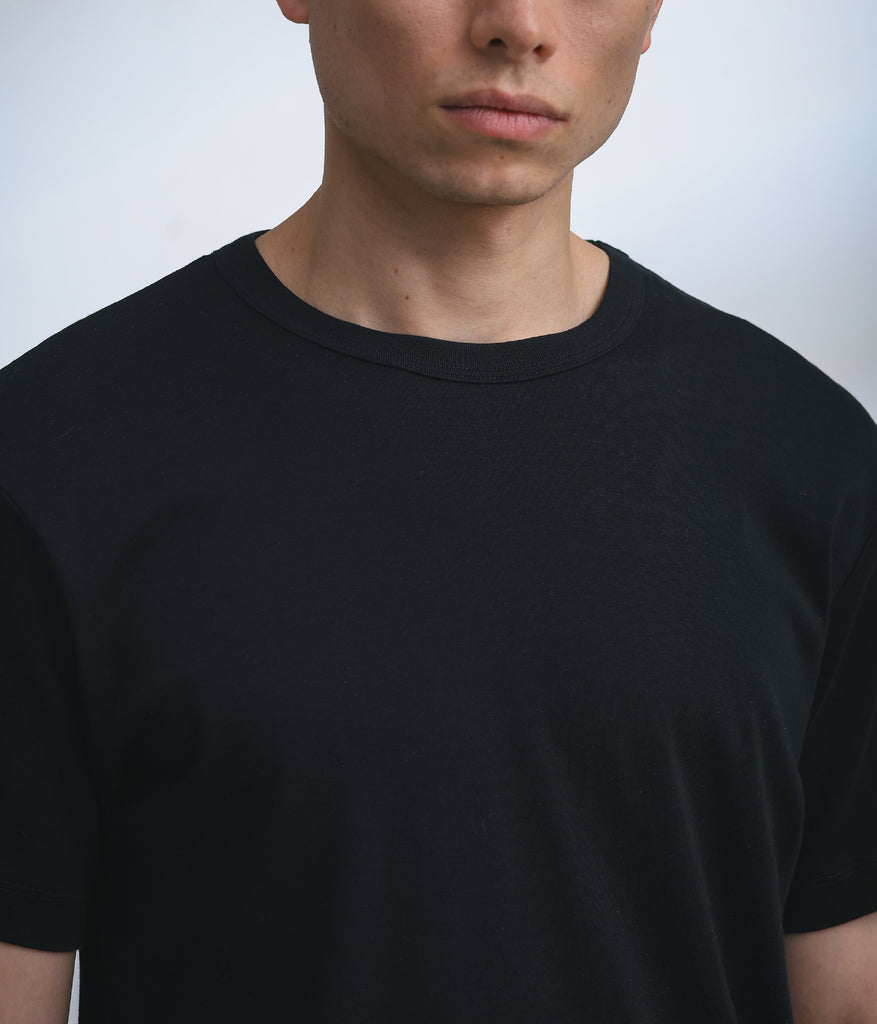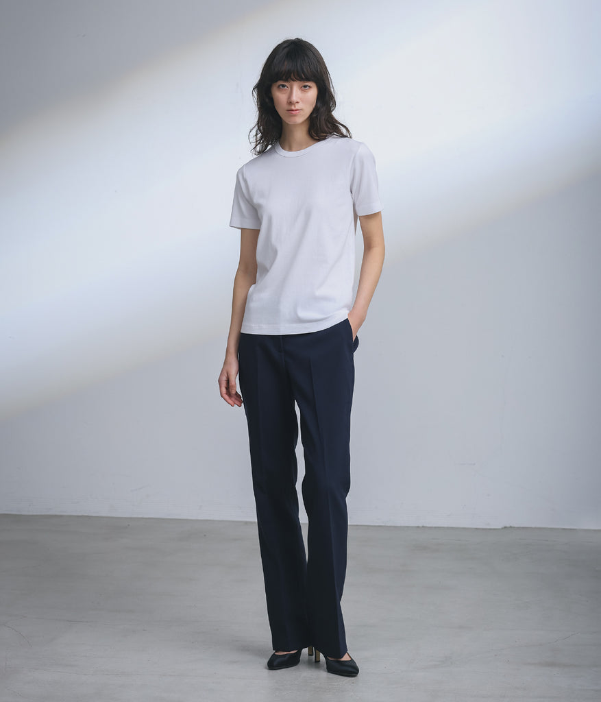 スリムフィットでコンパクトな印象のソフトストレッチTシャツ。襟元や袖に使われるリブ編み生地をボディ部分に贅沢に使いました。やや薄手で軽やか、非常に繊細なハイゲージのフライス組織は、とてもソフトでカラダのラインによく馴染みます。