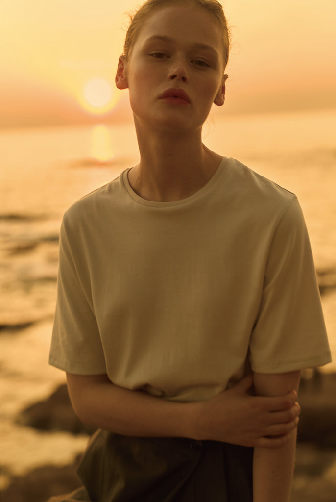 定番のCOTTONY® TEEをより女性にフィットする形にリニューアルした COTTONY® COMPACT TEE。ウエストラインを少し削り、衿幅を細く設定、また袖丈も少し長めにすることで腕周りがすっきり見えるようにしました。細部にもこだわり、裾や袖口を細二本針にすることでよりカジュアルさを抑え、華奢な印象に。