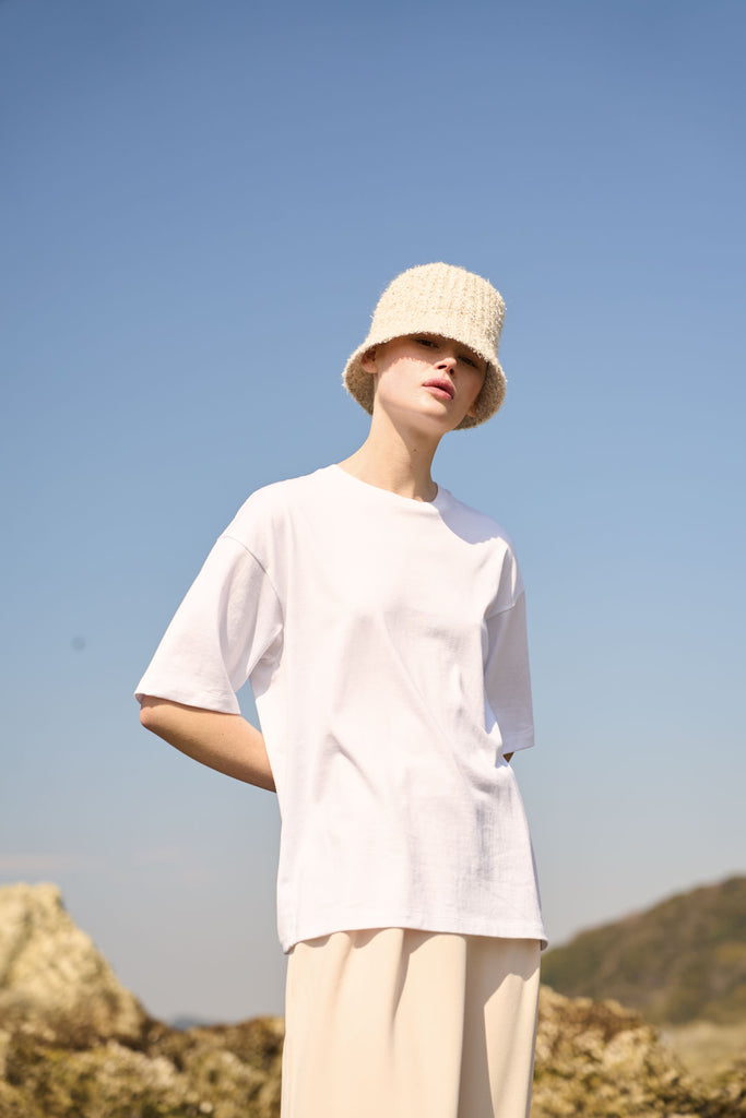 ユニセックスでお作りしているCOTTONY® BIG TEEを、女性向けにリサイズしCOTTONY® RELAX TEE。全体的にゆとりあるサイズながらも、着られている感がでないよう着丈や身幅を調整しています。また袖丈も腕周りがすっきりと見えつつ、だらしなさがでないような長さに。カジュアルに合わせるのはもちろん、モードにも着こなすことが出来る1枚です。