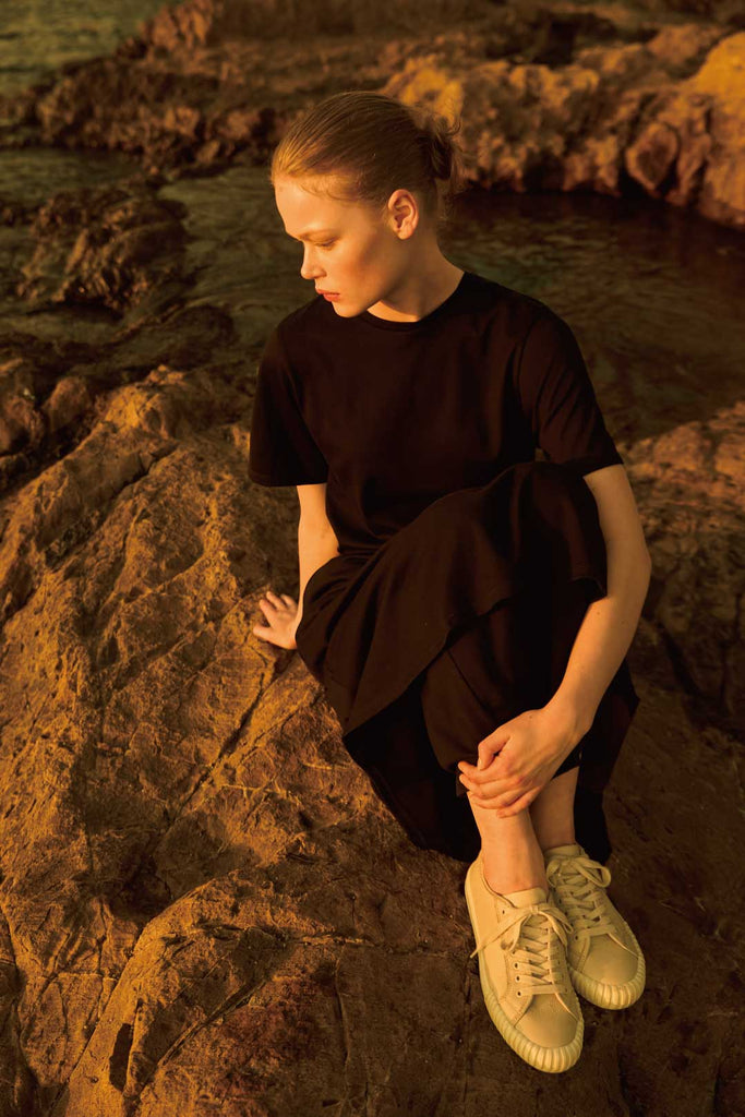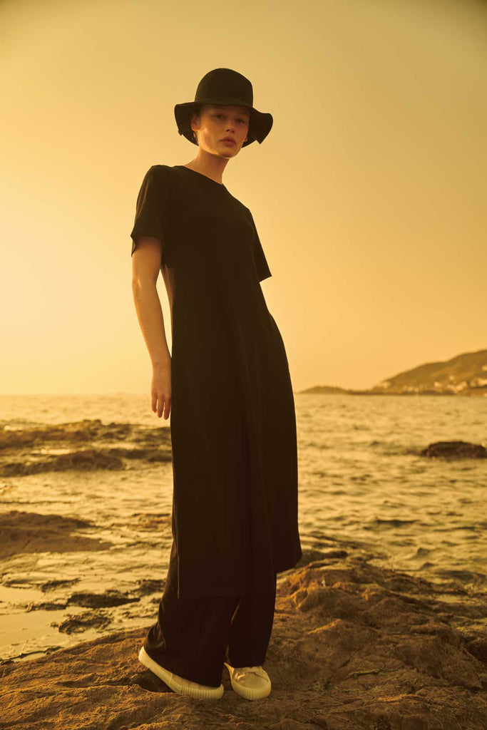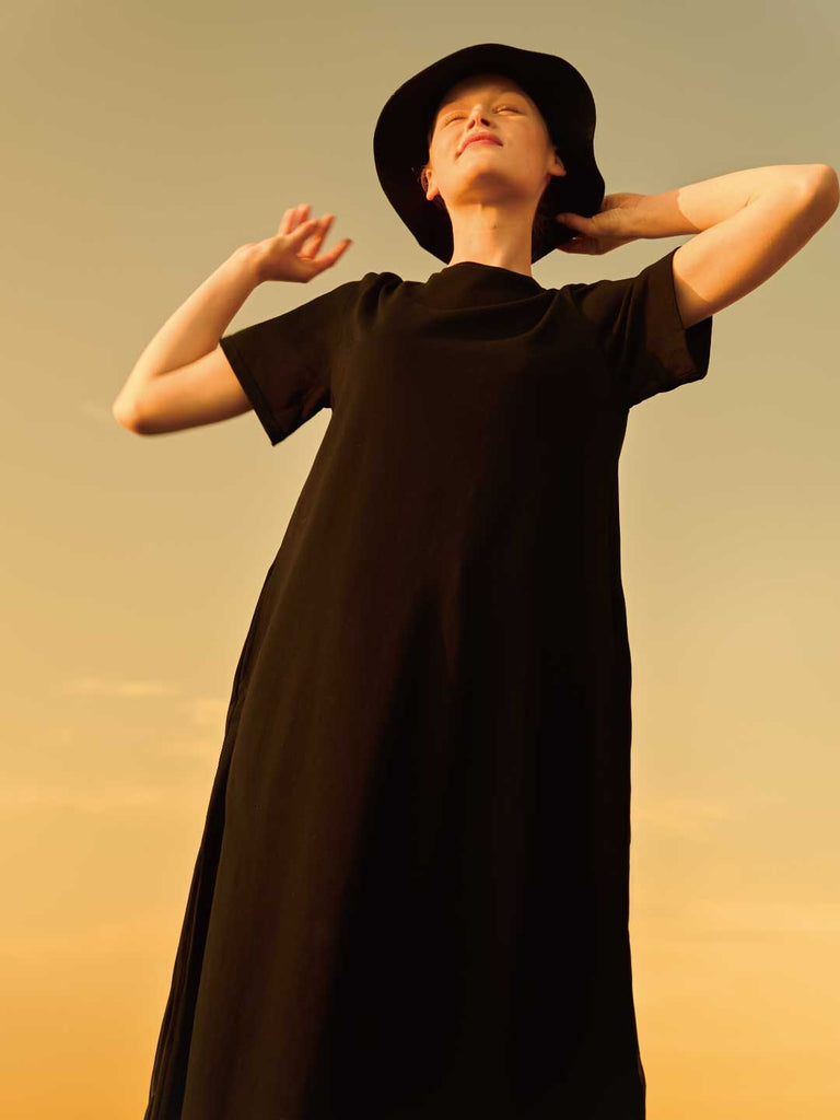 上品な光沢と適度なリラックス感を併せ持つCOTTONY®生地を贅沢に使用したドレス。ネックラインや肩周りはコンパクトにデザインし、歩くたびに緩やかに揺れるAラインシルエットが優美なムードを添えます。ONとOFF、デイ&ナイト、都会と自然の境界線を軽やかに超える万能ドレス。合わせる小物により様々な表情を見せてくれます。
