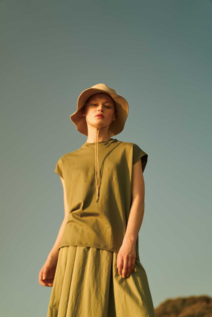 コットンなのにシルクのような光沢感と柔らかさを兼備したスリーブレスTシャツ。肩から腕にかけてしっかり包み込みながら大胆にスリーブをカットし、大きく広がらないアームホールにデザインしています。肩回りをコンパクトにデザインしながらふんわりとしたボリューム感のあるBOXYなシルエットはボディラインを拾いにくく、スタイリングの幅も広がる1枚に仕上がりました。