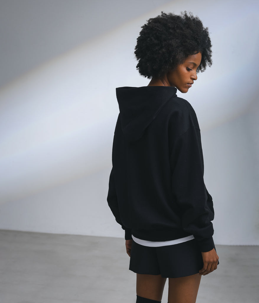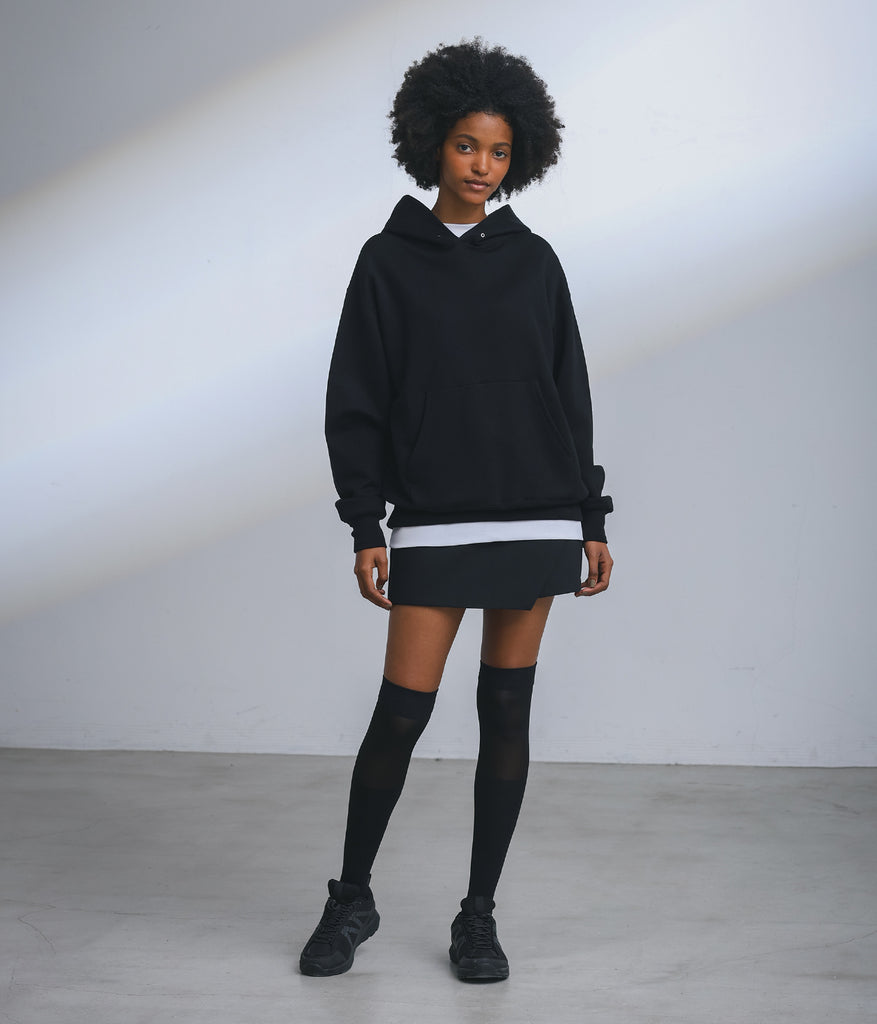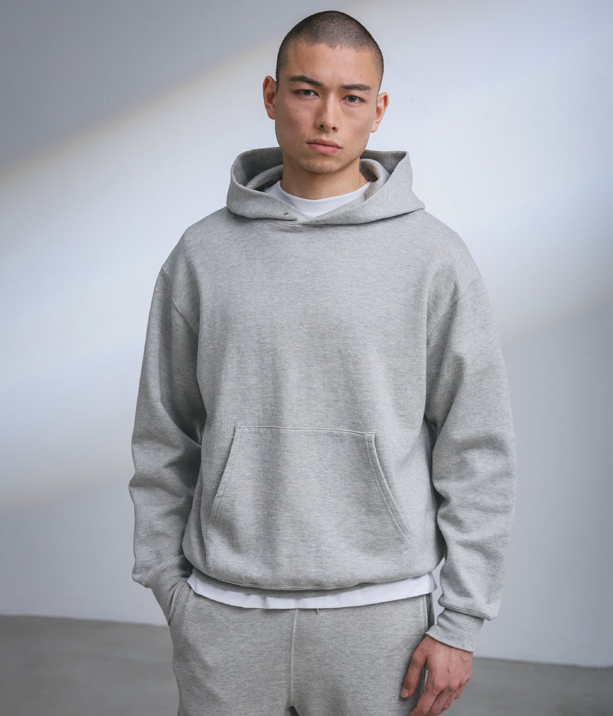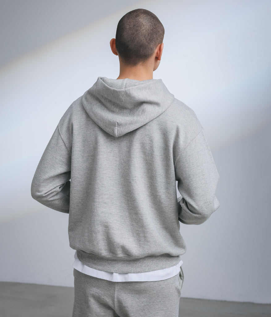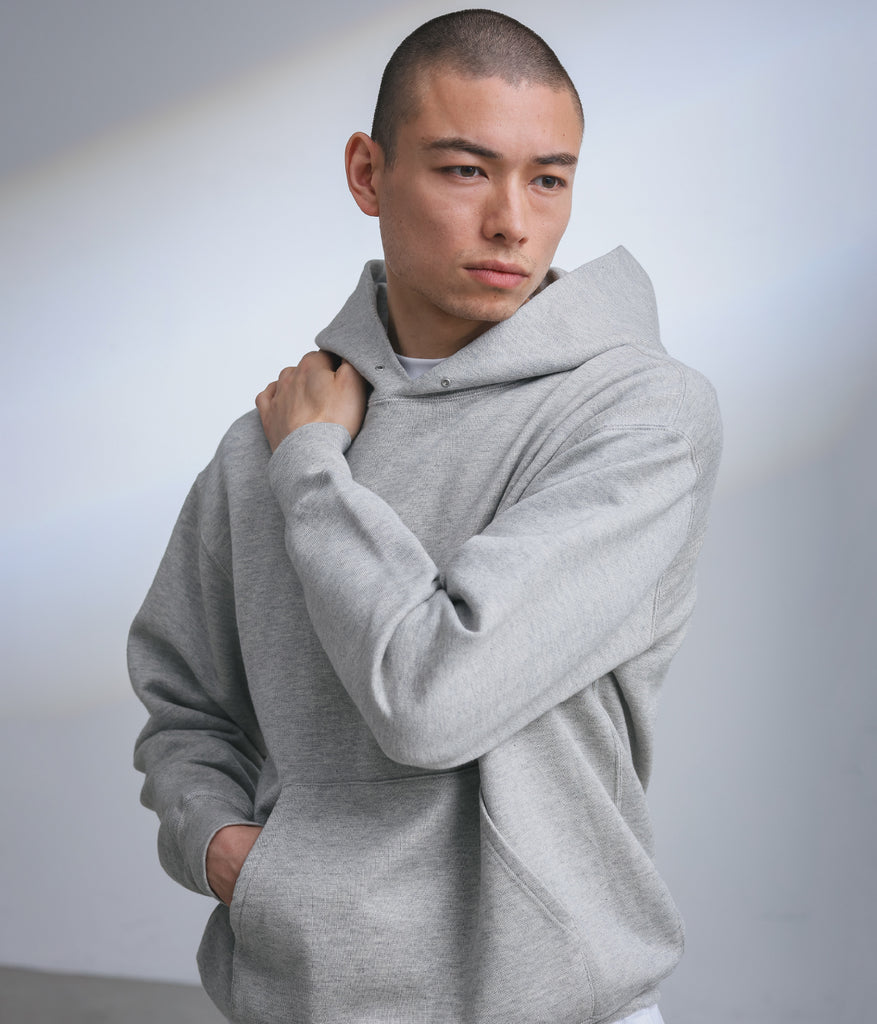 ドローコードを外しデザインを最低限に抑えることで、カジュアルな印象から品の良い抜け感あるフーディへとランクアップ。フロントの大きめなマフポケットもデザインのアクセントに。袖や裾に使用しているリブ素材は身体に程よくフィットし、なめらかでとろみのある着心地としなやかな落ち感で、つい手に取りたくなる一着です。